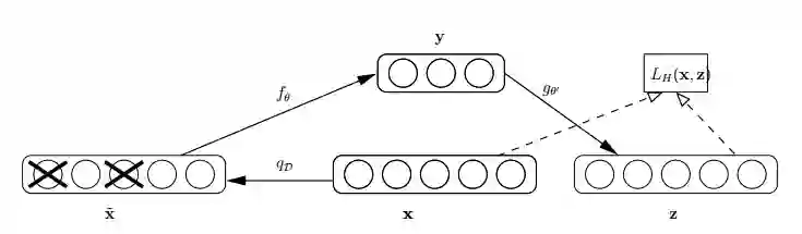 怎么才能使特征很鲁棒呢?就是以一定概率分布(通常使用二项分布)去擦除原始input矩阵,即每个值都随机置0, 这样看起来部分数据的部分特征是丢失了。以这丢失的数据 去计算 ,计算 ,并将 与原始 做误差迭代,这样,网络就学习了这个破损(Corruputed)的数据。网络结构如下图: