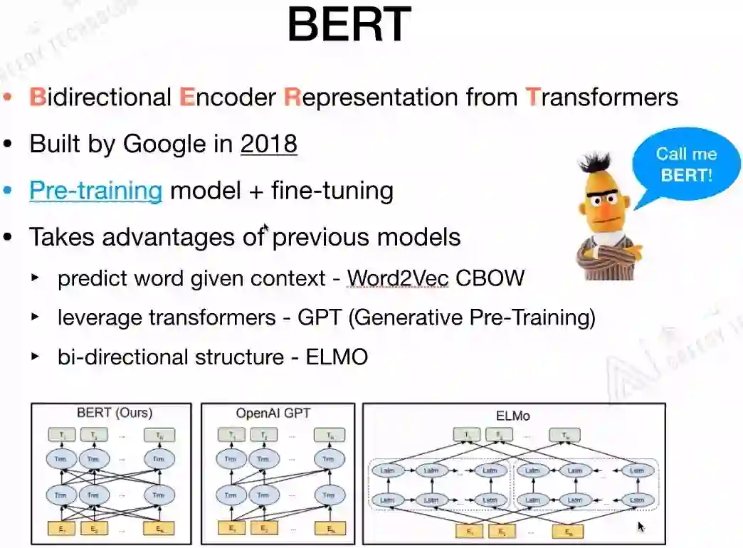 BERT的基本思想和Word2Vec、CBOW是一样的,都是给定context,来预测下一个词。BERT的结构和ELMo是相似的都是双向结构。第一个利用Transformer的并不是BERT,而是GPT。