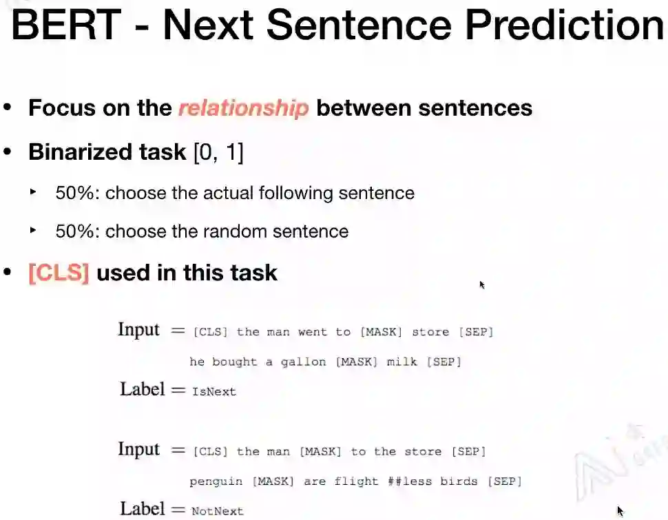 Next Sentence Prediction是更关注于两个句子之间的关系。与Masked Language Model任务相比,Next Sentence Prediction更简单些。