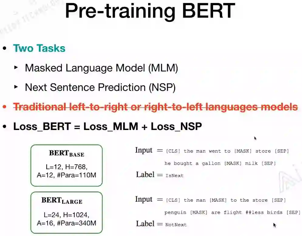 BERT是如何做预训练的?有两个任务:一是Masked Language Model(MLM);二是Next Sentence Predicition(NSP)。在训练BERT的时候,这两个任务是同时训练的。所以,BERT的损失函数是把这两个任务的损失函数加起来的,是一个多任务训练。