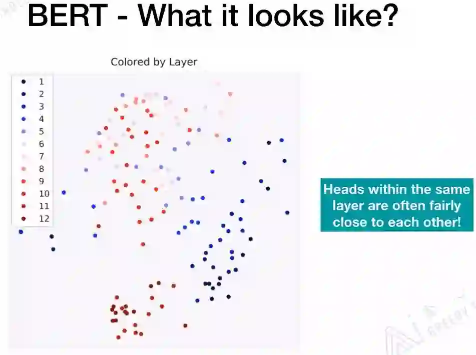 BERT的BASE版有12层的Transformer,下图中的每一个颜色代表一层的Transformer,相同颜色会聚集的比较近。相同层的head是非常相近的!