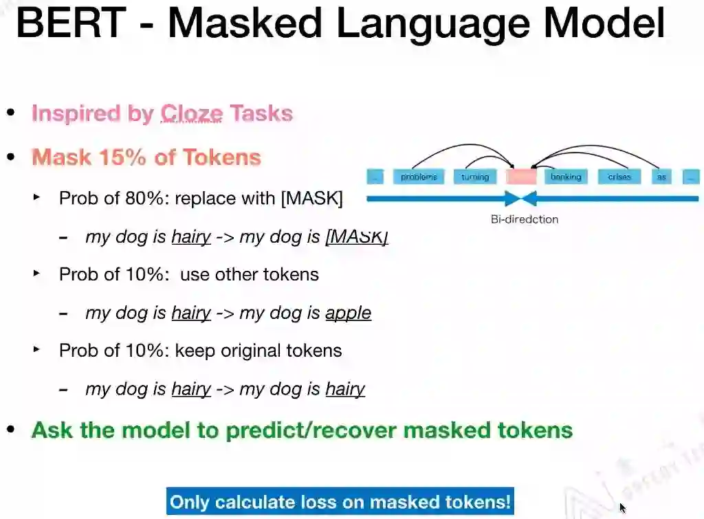 什么是Masked Language Model?它的灵感来源于完形填空。具体在BERT中,掩盖了15%的Tokens。这掩盖了15%的Tokens又分为三种情况:一是,有80%的字符用“MASK”这个字符替换;二是,有10%的字符用另外的字符替换;三是,有10%的字符是保持不动。最后在计算损失时,只计算被掩盖的这些Tokens,也就是掩盖了15%的Tokens。