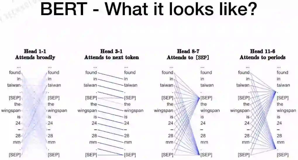 所以,对于每一个head来说,代表的意义是不一样的,这也是BERT强大的原因。BERT本身的Multi-Headed结构可以抓住不一样的特征,包括全局的特征、局部的特征等。