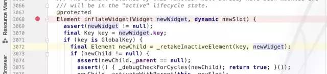 点击这个,当前断点就会被放行,程序继续运行,当运行到下一个断点时就会停下,也就是 inflateWidget 处,这样就可以避免调试中间的流程。当你在调试时,可以先选一些肯出错的地方,打上断点,然后再去调试。这样能更迅速的定位到 bug 所在。