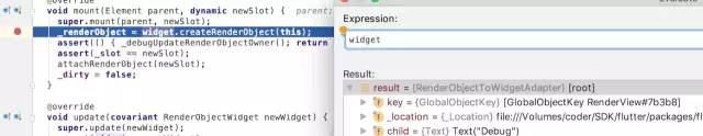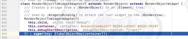 这里入参 widget 是什么,很显然,什么传入的是 this,表明是 RenderObjectToWidgetAdapter 对象。RenderObjectToWidgetAdapter 是什么,是包含着我们的 Text 的一个 Widget。