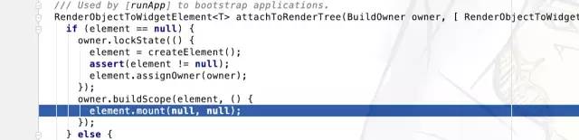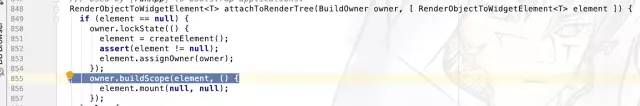 这样 RenderObjectToWidgetAdapter(Widget) 就被 RenderObjectToWidgetElement(Element) 纳为己有,元素也被成功创建,小蓝继续来到这里刚才创建元素的方法中。走几步便到达 owner.buildScope 方法,将刚才的元素传入,并在回调中执行元素的装载方法 (mount) 这是顶层元素的装配点,记住它被触发的时机,划重点,要考的。