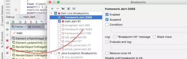 比如在 inflateWidget 这里再打个断点,运行时,首先会停留在第一个断点 mian 那里。