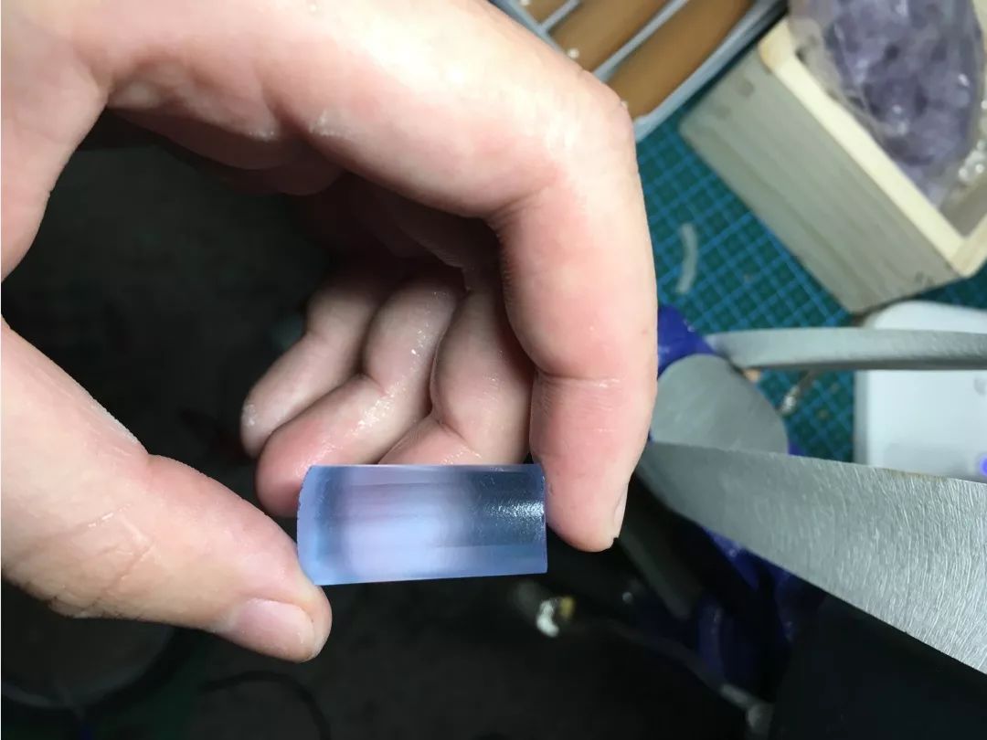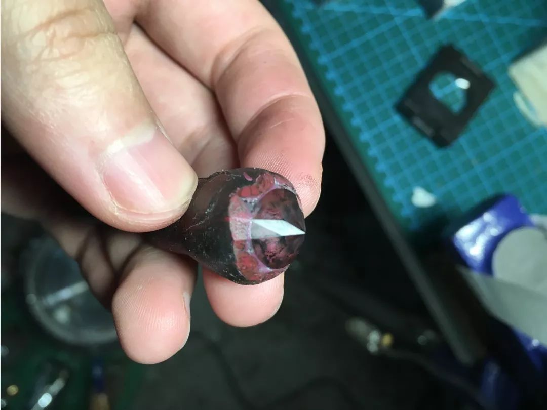 这是几个碎掉的玻璃杯子,先把它磨成一个圆柱体。再用专门打磨宝石的八角机,通过调整各种角度,最后磨成钻石的形状。这就是传说中的八心八箭。