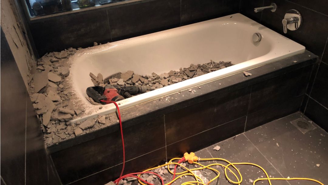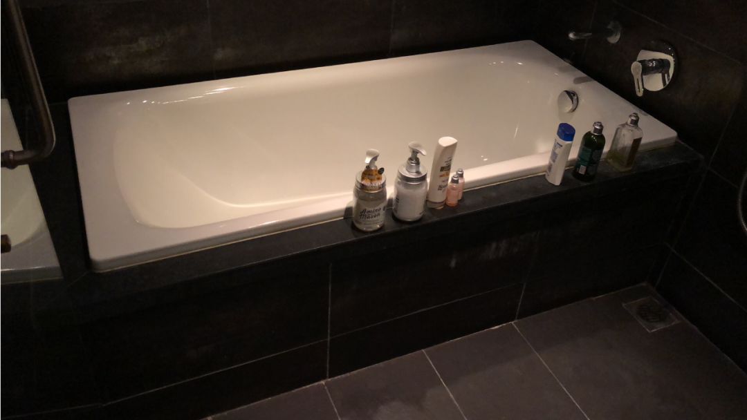 虽然它只有1.5平米,但是一个游泳池该有的元素它都有。比如射灯,还有蓝白相间的瓷砖。