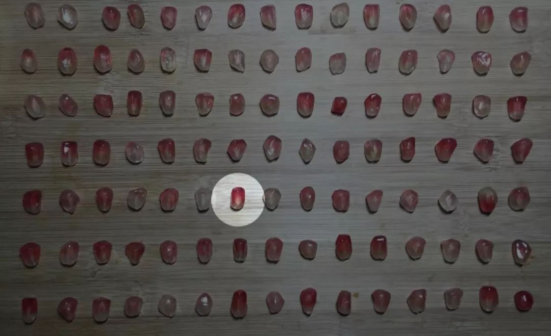 我当时举办了一次石榴籽选美大赛。我们当时仔细测量了每一颗石榴籽的尺寸,观察每一个石榴籽的切工。
