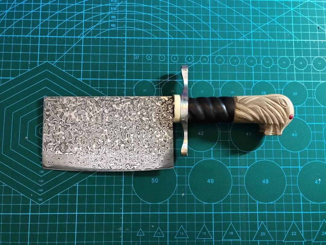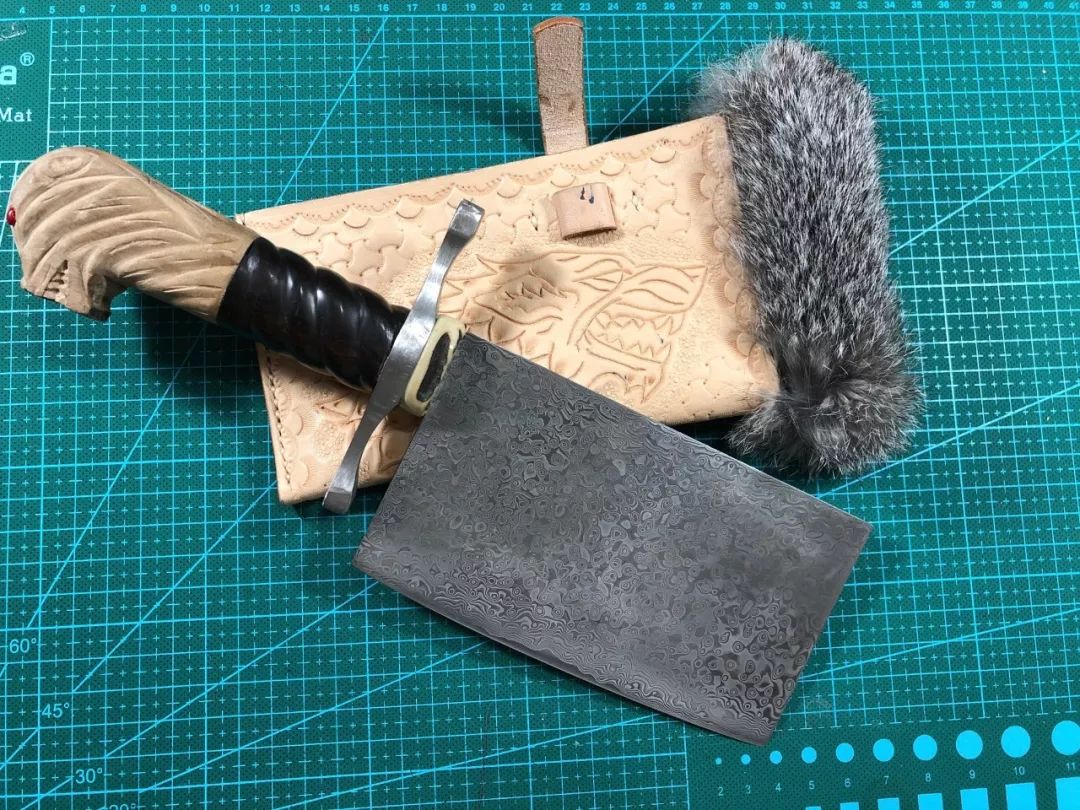 这把刀有个名字叫权力的菜刀,因为它的刀柄是《权力的游戏》里的一把剑。这些狼头都是自己做的,这个狼确实看起来有点像狗。