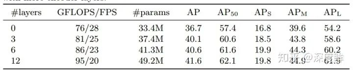 可以发现解码器也是越多越好,还可以观察到第一个解码器输出预测效果比较差,增加第二个解码器后性能提升非常多。上图中的NMS操作是指既然我们每个解码层都可以输入无序集合,那么将所有解码器无序集合全部保留,然后进行nms得到最终输出,可以发现性能稍微有提升,特别是AP50。