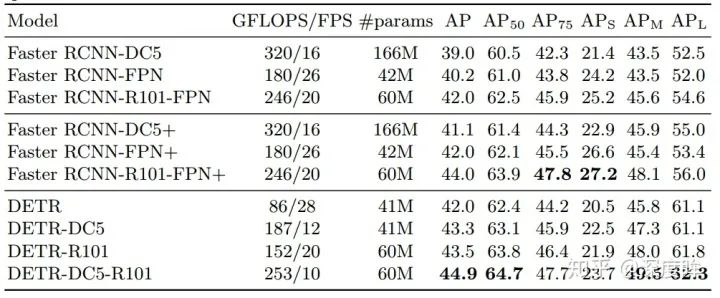 Faster RCNN-DC5是指的resnet的最后一个stage采用空洞率=stride设置代替stride,目的是在不进行下采样基础上扩大感受野,输出特征图分辨率保持不变。+号代表采用了额外的技巧提升性能例如giou、多尺度训练和9xepoch训练策略。可以发现detr效果稍微好于faster rcnn各种版本,证明了视觉transformer的潜力。但是可以发现其小物体检测能力远远低于faster rcnn,这是一个比较大的弊端。
