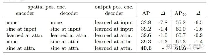作者对比了不同类型的位置编码效果,因为query_embed(output pos)是必不可少的,所以该列没有进行对比实验,始终都有,最后一行效果最好,所以作者采用的就是该方案,sine at attn表示每个注意力层都加入了sine位置编码,相比仅仅在input增加位置编码效果更好。