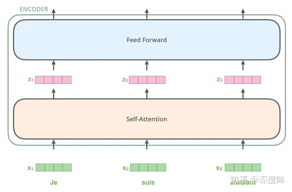输入是三个单词,为了能够将文本内容输入到网络中肯定需要进行向量化(不然单词如何计算?),具体是采用nlp领域的embedding算法进行词嵌入,也就是常说的Word2Vec。对于cv来说知道是干嘛的就行,不必了解细节。假设每个单词都可以嵌入成512个长度的向量,故此时输入即为3x512,注意Word2Vec操作只会输入到第一个编码器中,后面的编码器接受的输入是前一个编码器输出。
