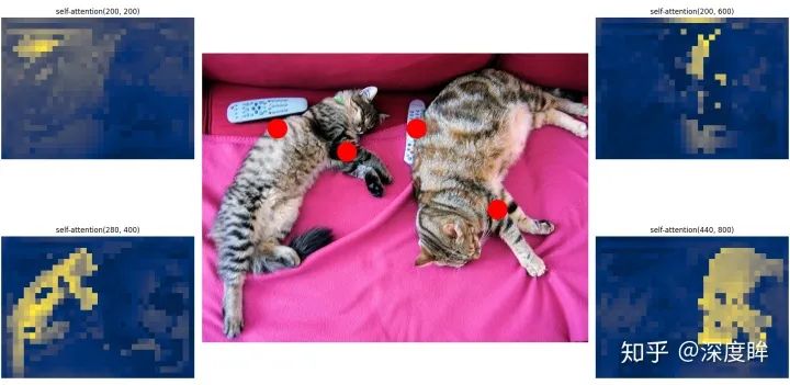 # 最后一个编码器中的自注意力模块权重输出(b,h//32xw//32,h//32xw//32),其实就是qk计算然后softmax后的值即(1,25x34=850,850)