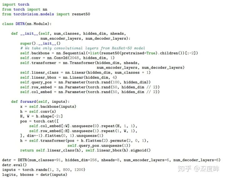基于transformer的detr算法,作者特意强调其突出优点是部署代码不超过50行,简单至极。