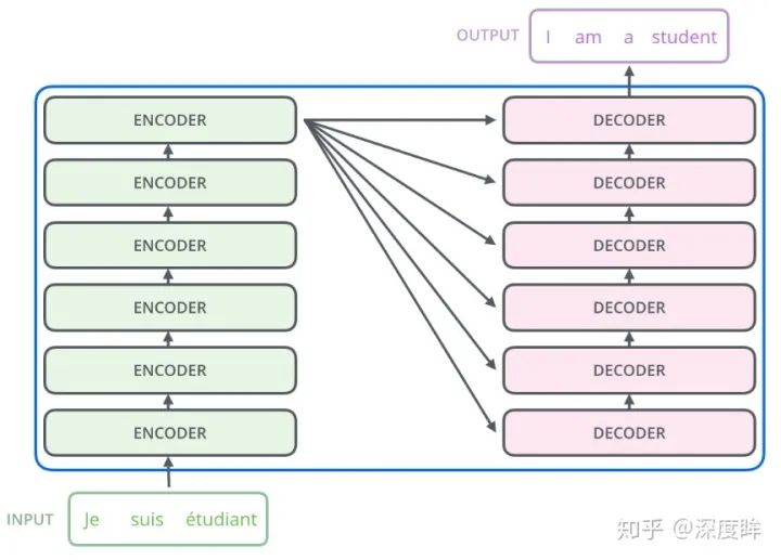 其包括6个结构完全相同的编码器,和6个结构完全相同的解码器,其中每个编码器和解码器设计思想完全相同,只不过由于任务不同而有些许区别,整体详细结构如下所示: