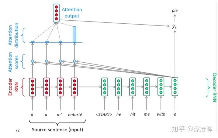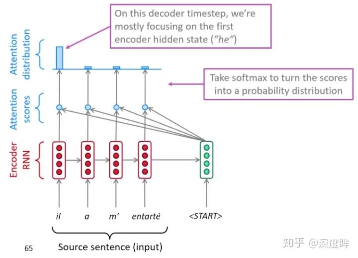 在没有attention时候,不同解码阶段都仅仅利用了同一个编码层的最后一个隐含输出,加入attention后可以通过在每个解码时间步输入的都是不同的上下文向量,以上图为例,解码阶段会将第一个开启解码标志<START>(也就是Q)与编码器的每一个时间步的隐含状态(一系列Key和Value)进行点乘计算相似性得到每一时间步的相似性分数,然后通过softmax转化为概率分布,然后将概率分布和对应位置向量进行加权求和得到新的上下文向量,最后输入解码器中进行解码输出,其详细解码可视化如下: