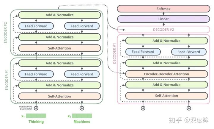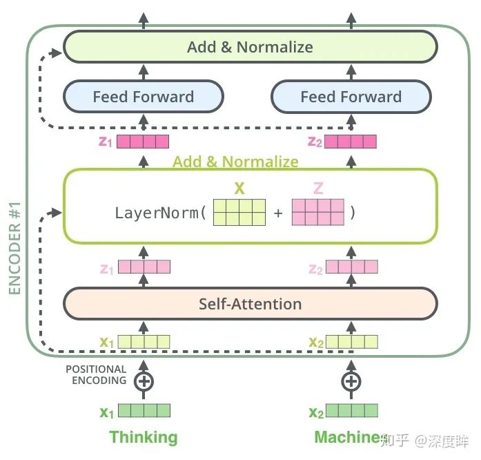 注意上图没有绘制出单词嵌入向量和位置编码向量相加过程,但是是存在的。