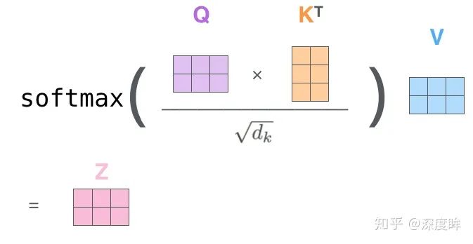 上述绘制的不是矩阵形式,更好理解而已。对于第一个单词的编码过程是:将q1和所有的k进行相似性计算,然后除以维度的平方根(论文中是64,本文可以认为是512)使得梯度更加稳定,然后通过softmax传递结果,这个softmax分数决定了每个单词对编码当下位置(“Thinking”)的贡献,最后对加权值向量求和得到z1。