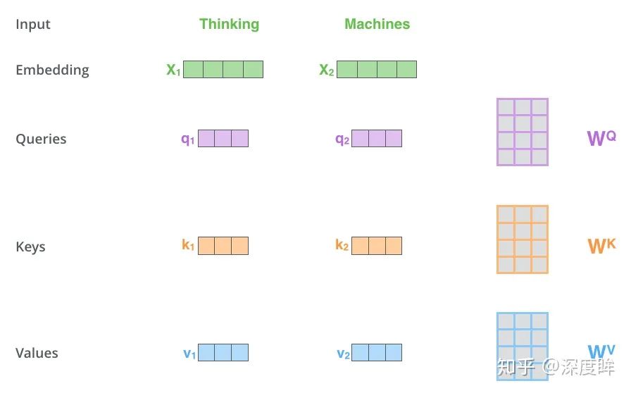 假设我们现在要翻译上述两个单词,首先将单词进行编码,和位置编码向量相加,得到自注意力层输入X,其shape为(b,N,512);然后定义三个可学习矩阵 (通过nn.Linear实现),其shape为(512,M),一般M等于前面维度512,从而计算后维度不变;将X和矩阵