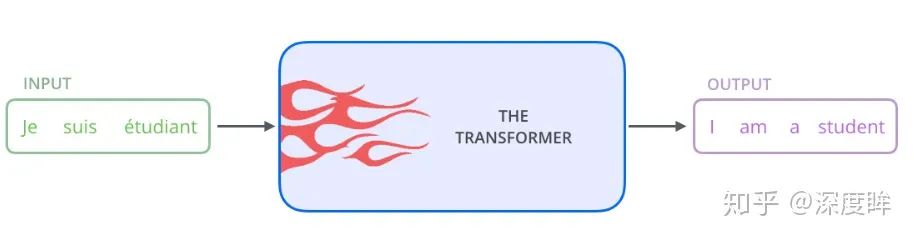 一般讲解transformer都会以机器翻译任务为例子讲解,机器翻译任务是指将一种语言转换得到另一种语言,例如英语翻译为中文任务。从最上层来看,如下所示: