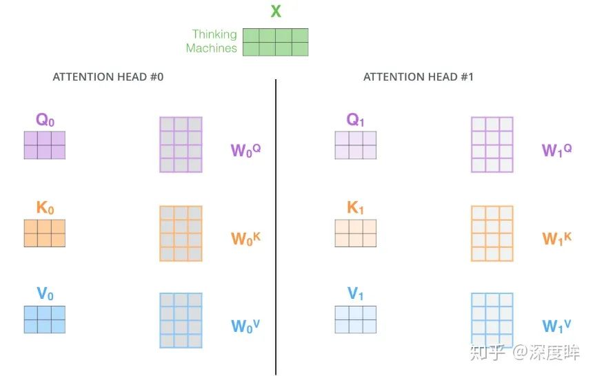 简单来说就是类似于分组操作,将输入X分别输入到8个attention层中,得到8个Z矩阵输出,最后对结果concat即可。论文图示如下: