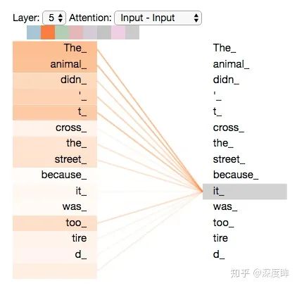通过前面分析我们知道自注意力层其实就是attention操作,并且由于其QKV来自同一个输入,故称为自注意力层。我想大家应该能想到这里attention层作用,在参考资料1博客里面举了个简单例子来说明attention的作用:假设我们想要翻译的输入句子为The animal didn't cross the street because it was too tired,这个“it”在这个句子是指什么呢?它指的是street还是这个animal呢?这对于人类来说是一个简单的问题,但是对于算法则不是。当模型处理这个单词“it”的时候,自注意力机制会允许“it”与“animal”建立联系即随着模型处理输入序列的每个单词,自注意力会关注整个输入序列的所有单词,帮助模型对本单词更好地进行编码。实际上训练完成后确实如此,google提供了可视化工具,如下所示: