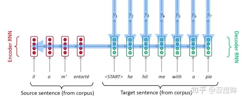 encoder和decoder在早期一般是RNN模块(因为其可以捕获时序信息),后来引入了LSTM或者GRU模块,不管内部组件是啥,其核心思想都是通过Encoder编码成一个表示向量,即上下文编码向量,然后交给Decoder来进行解码,翻译成目标语言。一个采用典型RNN进行编码码翻译的可视化图如下:
