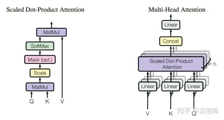 先忽略Mask的作用,左边是单头attention操作,右边是n个单头attention构成的多头自注意力层。