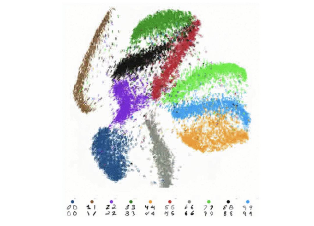 完整 MNIST 数据集的 tSNE 嵌入的实时演变,该数据集包含60000个手写数字的图像
