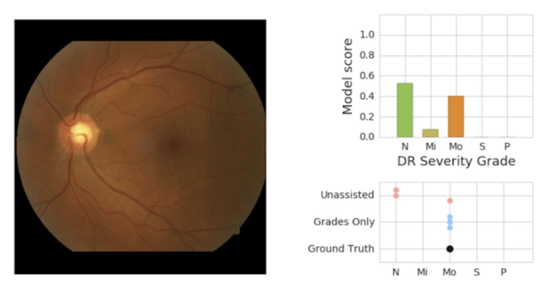在2016年底,我们发表的一项研究表明,经过训练的用于评估视网膜眼底图像以检测糖尿病视网膜病变迹象的模型,其表现与美国医学委员会认证的眼科医生相当,甚至略好于后者。