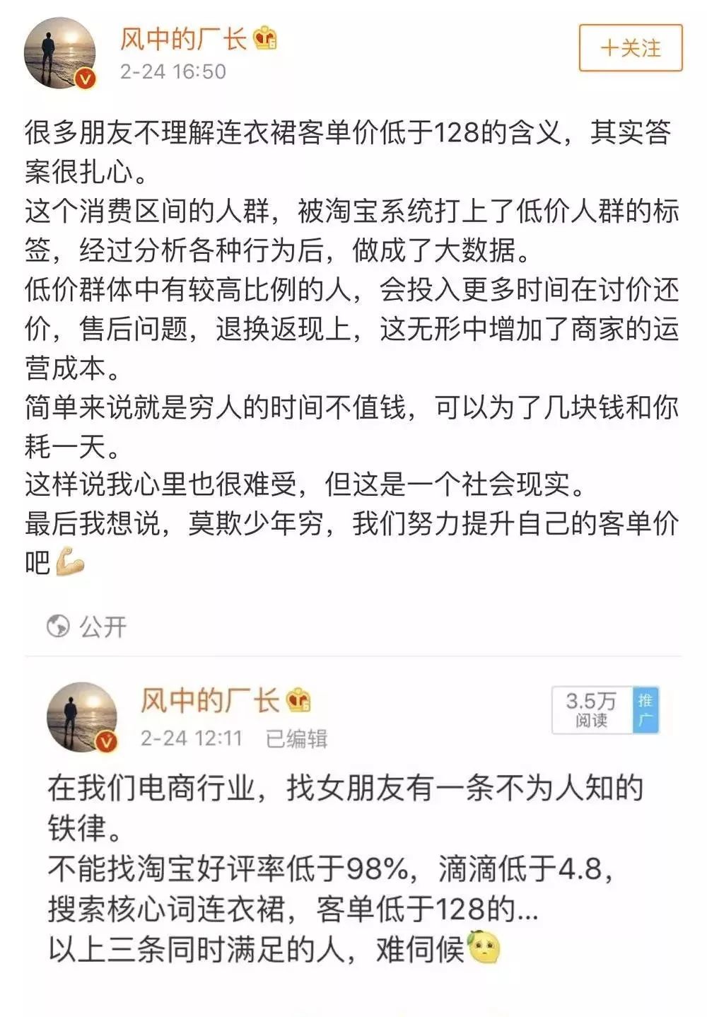 对此话题,昨日网上却掀起了一个关于“连衣裙客单价低于128”的讨论,有网友解释,这个消费区间的人群,被淘宝系统打上了低价人群的标签,经过分析各种行为后,做成了大数据。低价群体中有较高比例的人,会投入更多时间在讨价还价,售后问题,退换返现上,这无形中增加了商家的运营成本。(新浪科技)