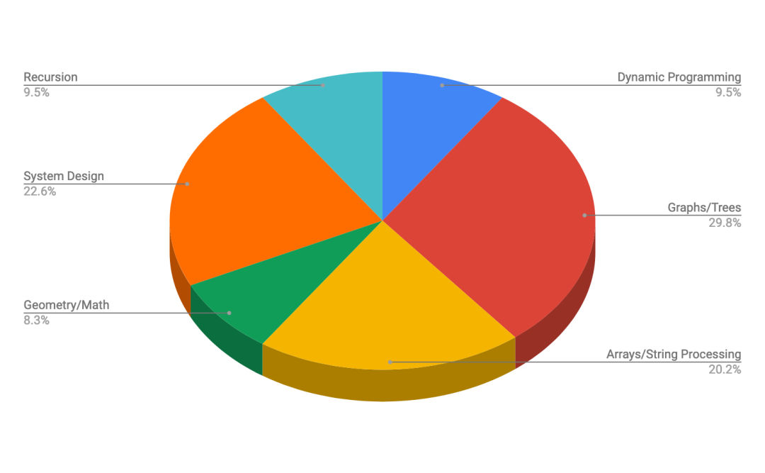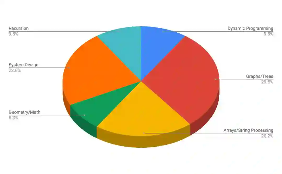 我们分析了 Glassdoor 中的几百条面试经历,总结出了谷歌面试中最常问到的问题类型分布。