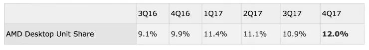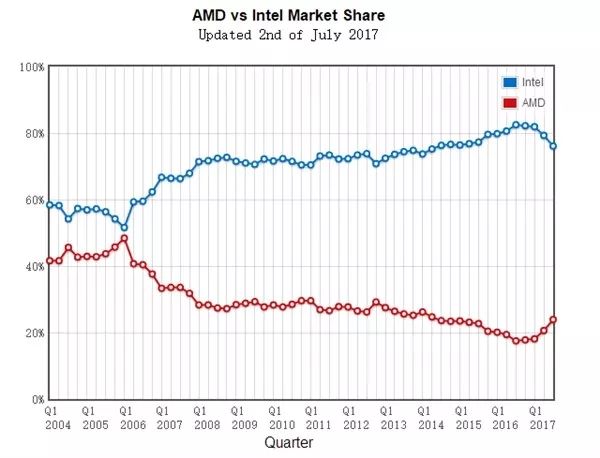 我们知道,AMD 长期以来在 CPU 领域一直被英特尔压着打,市场份额更是遥遥落后。不过,据雷锋网(公众号:雷锋网)了解,随着去年正式发布 Ryzen 系列处理器,这一情况有了很大的改观。