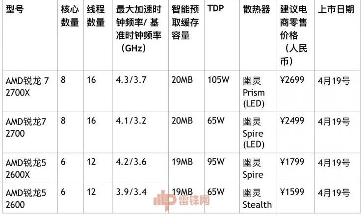 雷锋网消息,4 月 19 日 AMD 宣布推出第二代 Ryzen (锐龙)台式处理器,首批四款型号为锐龙7 2700X、锐龙7 2700、锐龙5 2600X 和锐龙5 2600,均全面针对游戏玩家,内容创建者者和硬件发烧友优化。