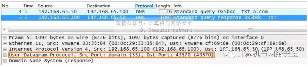 根据RFC1035中定义的DNS消息格式以及所能支持的内容长度,UDP包传输大小被限制为512个字节,超出的部分将被截断,或丢弃或使用TCP协议重传(端口仍为53)。