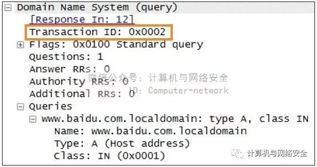 要完成上述攻击,攻击者需要具备什么条件才能向目标开火呢?我们知道要实施攻击(将数据引向攻击目标),这里有一个前提,就是必须能伪造DNS查询的源IP。我们看一个普通的DNS查询(A记录)示例(见图12)。