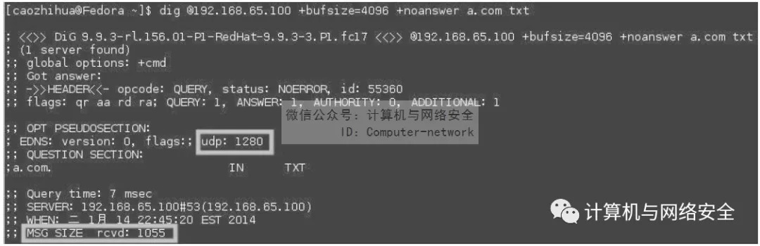 可以看到(第一个框),这台启用EDNS机制的DNS服务器所支持的最大UDP传输大小为1280个字节,查询反馈的大小是1055个字节(突破了512个字节的限制),但仍采用的是UDP协议(注意第二个框)。对应的数据包如图15所示。