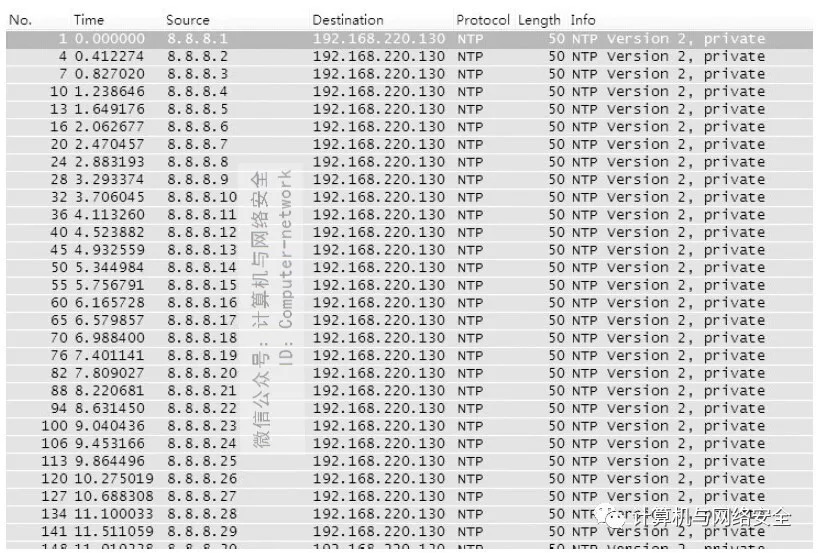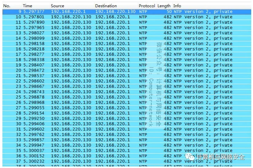 实际上,monlist请求返回的数据量与一段时间内和NTP服务器交互的客户端数量有关。如果NTP服务器与大量的客户端进行交互,那么一个不超过64个字节的请求数据包就能够触发100个482个字节的响应数据包。如图1所示。