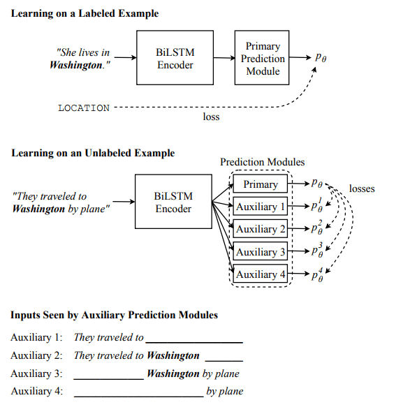 因此,我们提出了 Cross-View Training(CVT),这是一种半监督学习算法,可混合使用有标注和无标注数据来提升 Bi-LSTM 句子编码器的表征。在有标注的样本上,我们使用标准的监督学习。在无标注的样本上,CVT 会教能看到输入的受限视角(比如句子的一部分)的辅助预测模块匹配能看到完整输入的整个模型的预测。因为辅助模块与完整模型共享中间表征,所以这反过来又能改进整个模型。