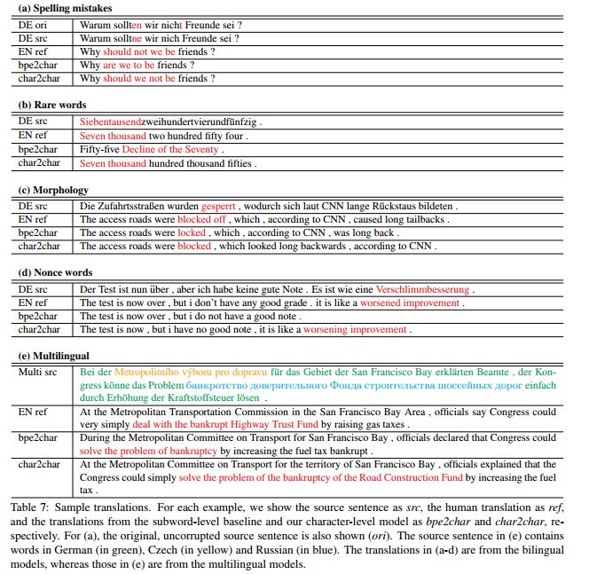 DeepMind 的《Neural Machine Translation in Linear Time》和 Lee et al 的《Fully Character-Level Neural Machine Translation without Explicit Segmentation》展示了在字符层面上实现的翻译。这些结果尤其引人注目,因为翻译任务需要对基础文本有非常好的语义理解。