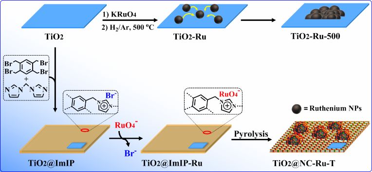 在国家自然科学基金(21603228, 21673241 和 21471151)和中国科学院战略性先导科技专项(XDB20000000)的资助下,中科院福建物质结构研究所结构化学国家重点实验室研究员王瑞虎课题组选用离子聚合物包裹的二氧化钛纳米片复合材料,通过离子交换技术将钌离子均匀分布在离子聚合物中,从而有效抑制高温焙烧过程中钌纳米粒子的团聚,原位得到小尺寸、高分散的超细金属纳米粒。同时,生成的氮掺杂碳不仅提高了催化剂的导电性,降低了肖特基能垒,促进了光生电子从激发态钌纳米粒向二氧化钛表面转移,还增强了反应底物分子的吸附和钌纳米粒的活性,使水介质中光催化醇氧化反应的活性提高了4倍以上。该催化材料具有极好的稳定性,多次循环使用后纳米粒的尺寸、分布和晶面等都没有发生明显变化。该研究有效解决了金属纳米粒在高温焙烧过程中团聚和分散的问题,为碳负载的超细纳米粒的合成提供了新途径。