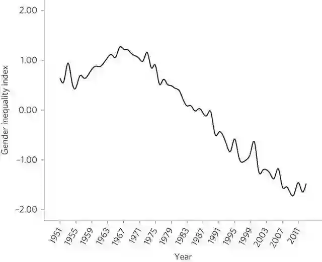 为了衡量美国不同年代的女性地位,研究者使用了“性别不平等指数”,这个指数来自男女工资差距、女性在国会中的代表数量、新出版的报告和著作中的女性代词数量(例如She和her),以及盖洛普公司对于性别平等的调查数据。性别不平等指数越高,说明女性地位越低。