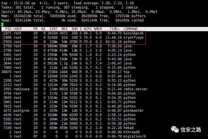 登录服务器,查看系统进程状态,发现不规则命名的异常进程、异常下载进程 :