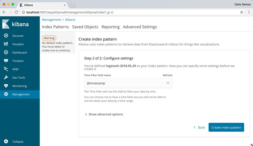 然后,通过选择 @timestamp 指定时间过滤器字段名称,然后单击 Create index pattern按钮。