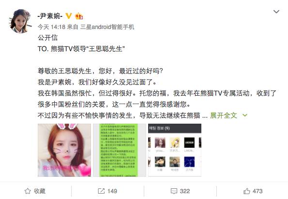 熊猫TV自成立以来,在签约主播的事情上出手就比较阔绰。但就在今天下午,熊猫TV签约的女主播尹素婉却在微博上发布了一篇公开信《TO. 熊猫TV领导“王思聪先生”》,向王思聪讨要说法。