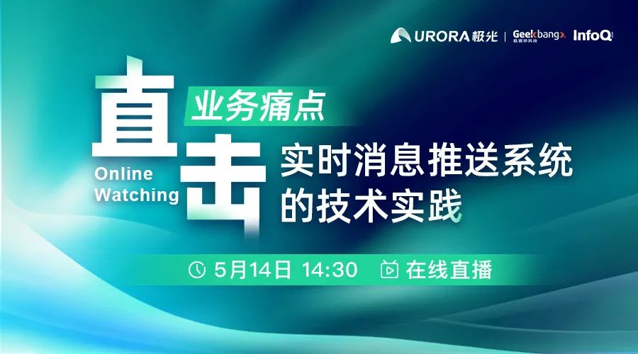 5.14 日 14:30【极光 live】直击业务痛点,实时消息推送系统的技术实践。当前很多应用都对消息推送的实时性、有效送达率有很高的要求。本次分享将会结合极光推送在消息推送的实时性、可靠送达、服务高可用等方面的实践经验,探讨如何解决海量业务数据存储、及时处理业务请求、稳定的长链接服务等问题。同时,向广大开发者介绍如何打造支撑亿级用户的高并发大容量消息推送系统。点击阅读原文报名吧,前 200 报名有极光定制周边福利一份噢~