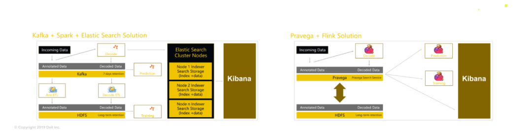 有了 Pravega 提供的存储层以后,大数据架构将会变成如上图右侧所示,并带来以下改变: